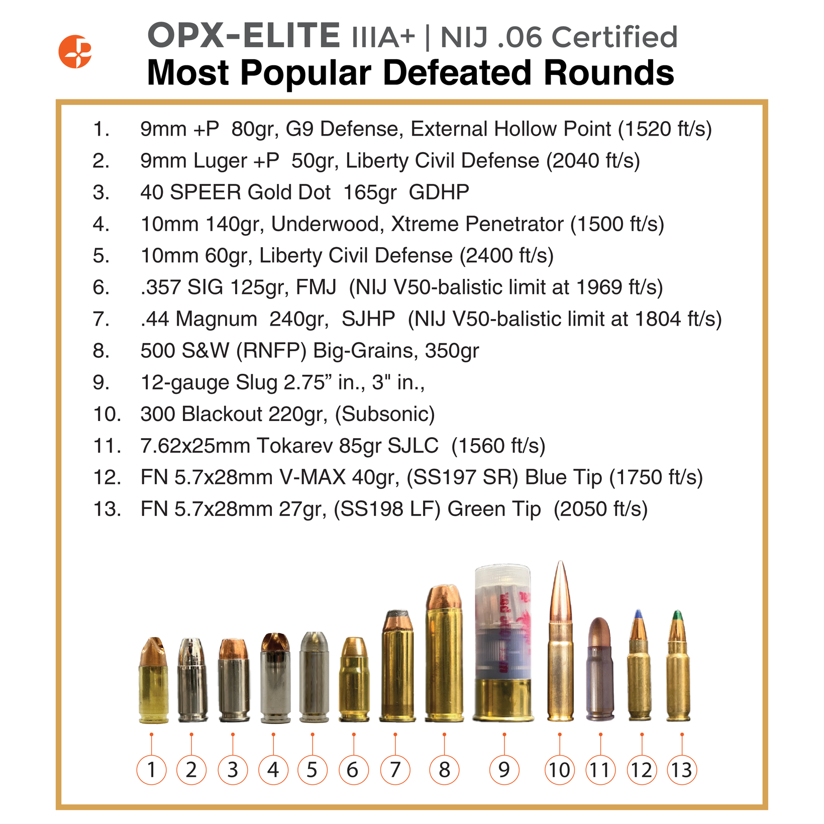 OPX-ELITE – NIJ-certified and listed Level IIIA soft armor (Standard 0101.06), proven to stop handgun rounds up to .44 Magnum.