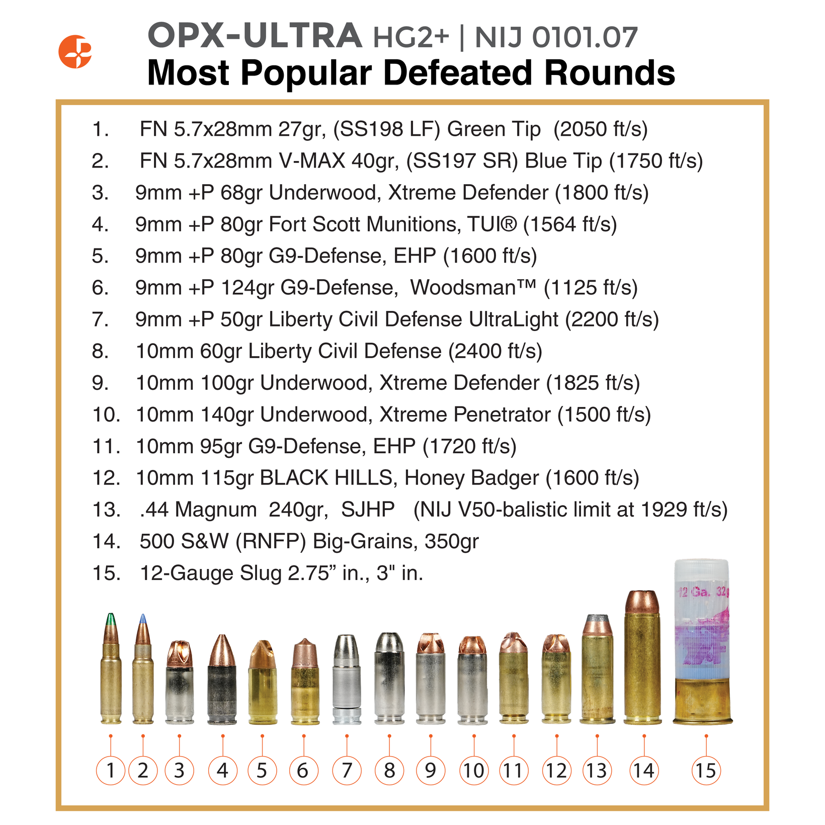 OPX-ULTRA – Our most capable Level HG2+ soft armor (Standard 0101.07), purpose-built to defeat even challenging monolithic solid copper handgun rounds, all while maintaining a discreet profile under clothing.